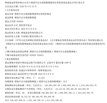 中国经济网络北京,9月10日。今天,Bodao Fund Management Co.,Ltd。宣布了有关改进的婚礼婚礼Index CSI证券投资基金的有效条目的广告。融资期间的净订购金额为1,910,693,003.79元人民币,在融资期间,订购基金产生的利息为RMB404,695.90元,股票总数为1,911,097,6999.69诉讼。 Yangmen基金管理员于2011年7月至2014年6月是ABC Huili Fund Management Co.,Ltd。。f定量投资部门。